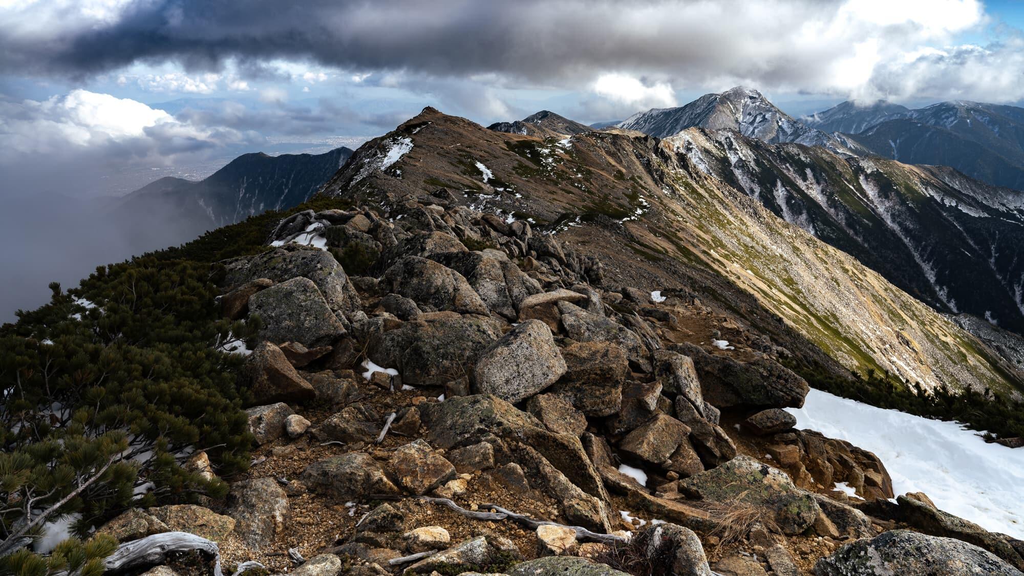 At an altitude of 2,800m I arrived at the ridge of the Northern Alps and I could look along the path that I would be tackling that day. Thanks to the wide angle-of-view of the 24mm lens, I was able to include the entirety of the mountain ridge in my shot from this position.
