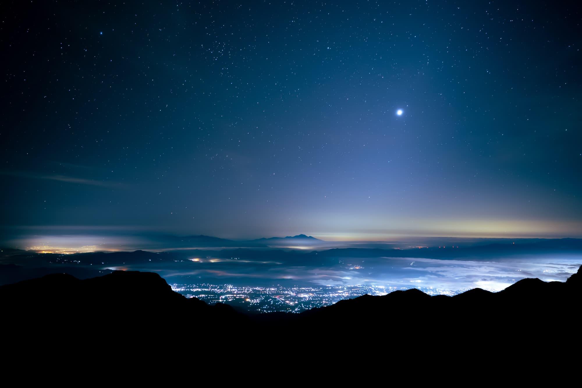 The sky was covered in a dense fog when I peeked out of my tent at 10pm. I was able to take a photograph of Mt. Yari as it stood illuminated by the moonlight.