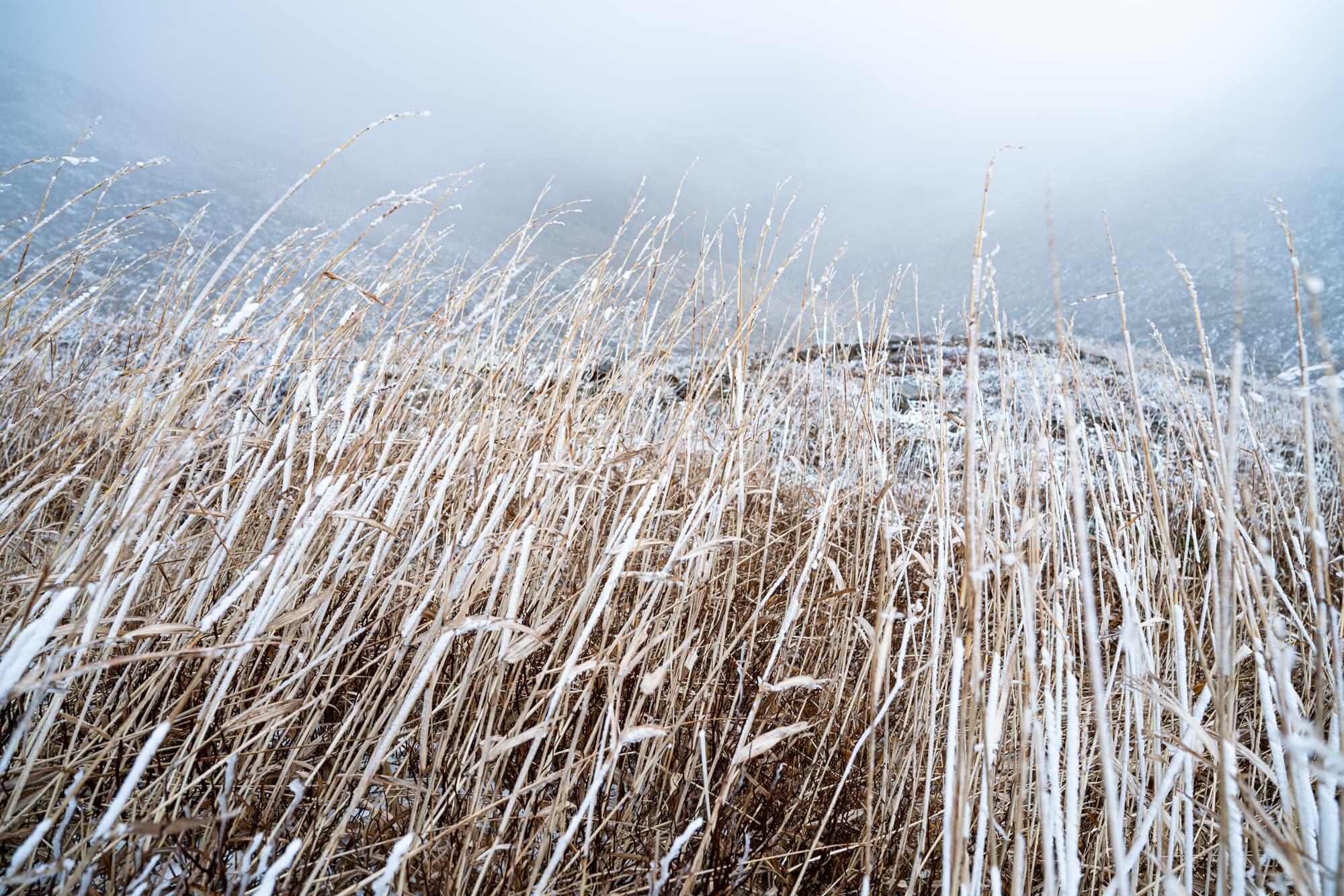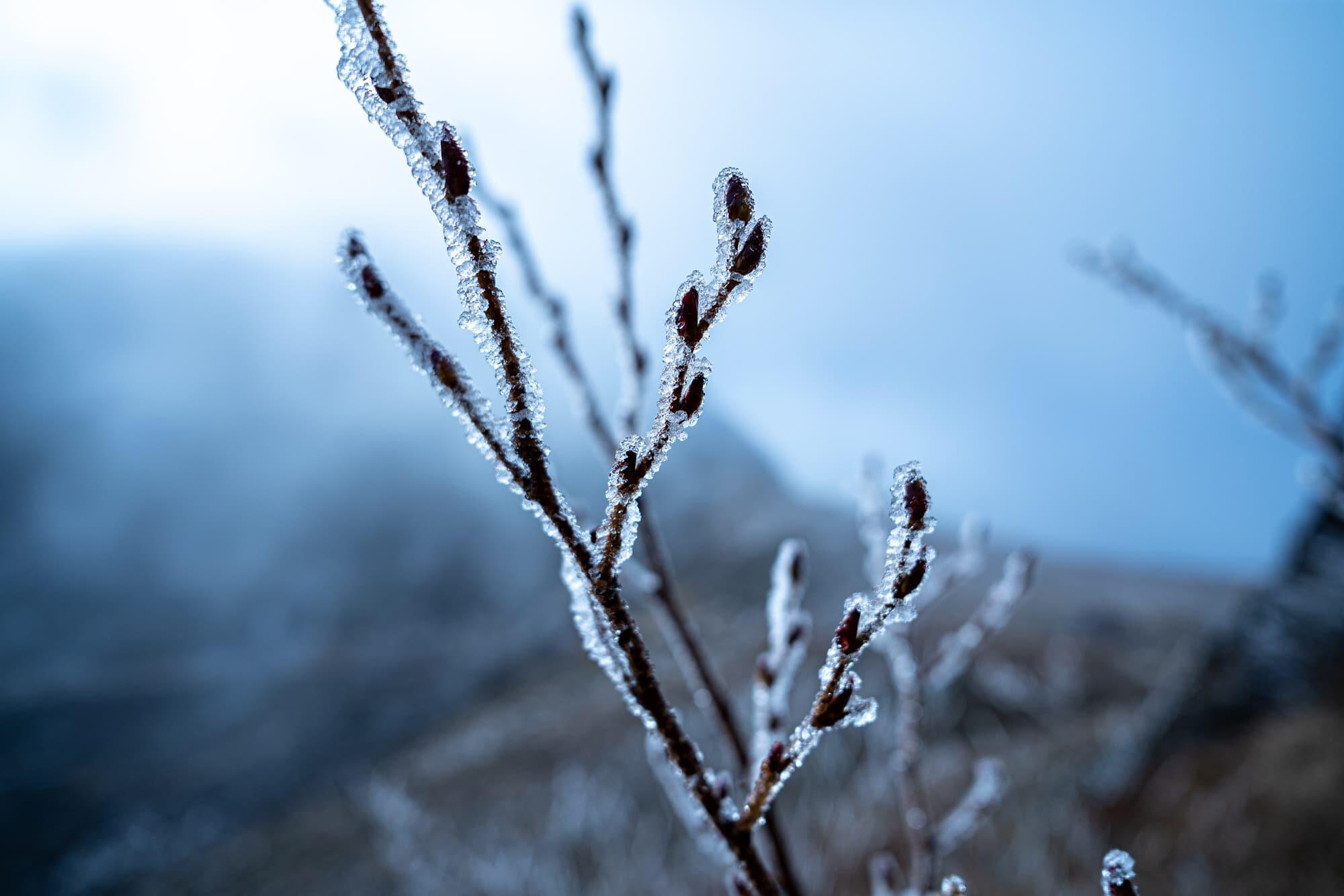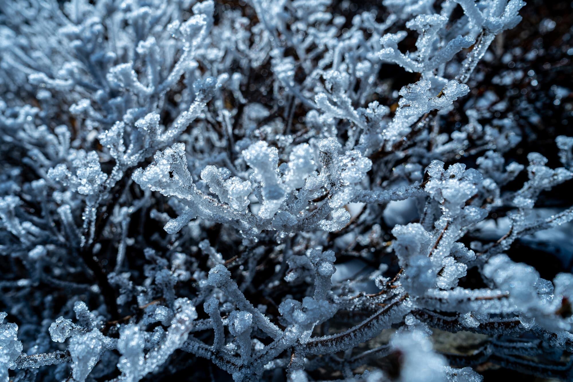 Fog had been rising since the previous day, and a strong wind was blowing. Rocks and trees at the summit were covered by a layer of frost, giving me the chance to try out the macro capability of the 24mm lens, with its minimum focusing distance of 10cm.