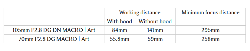 The working distance of the 105mm F2.8 DG DN MACRO | Art at its minimum focus distance is 141mm (84mm with the hood on). The one of the 70mm F2.8 DG MACRO | Art is 59mm (55.8mm with the hood on). This means that the working distance of this lens is longer than the one of the 70mm F2.8 DG MACRO | Art by up to 82mm.