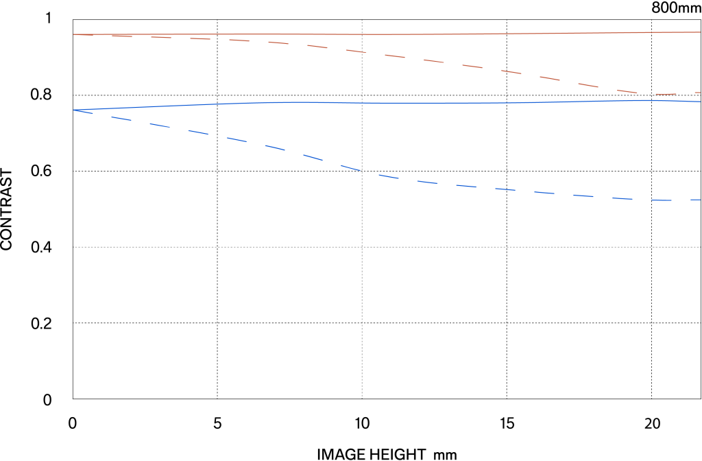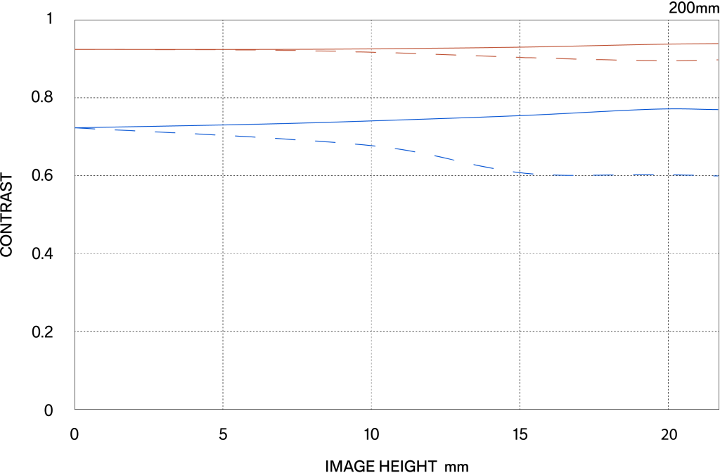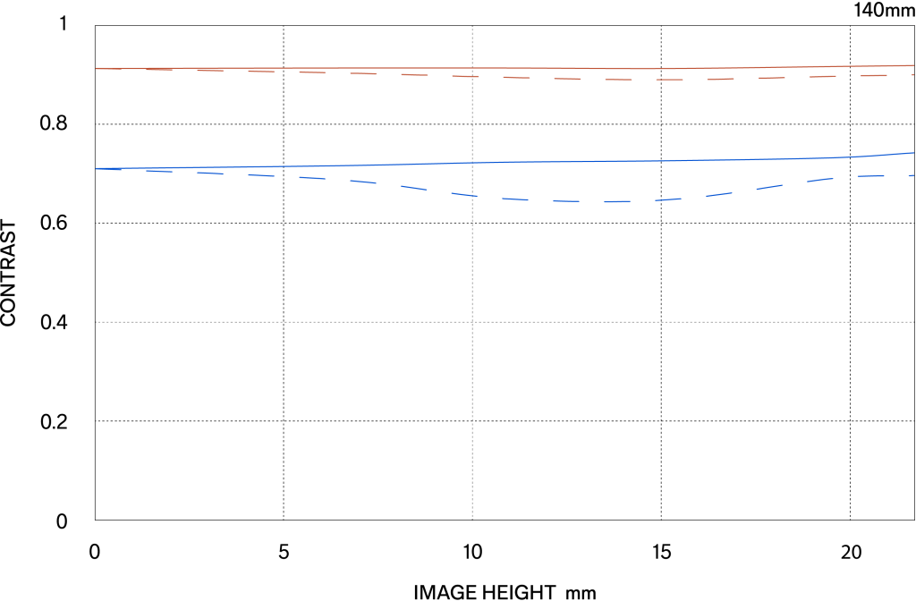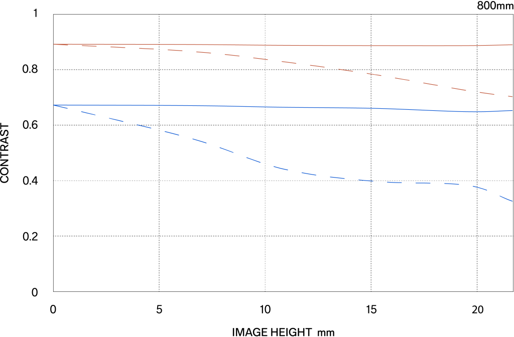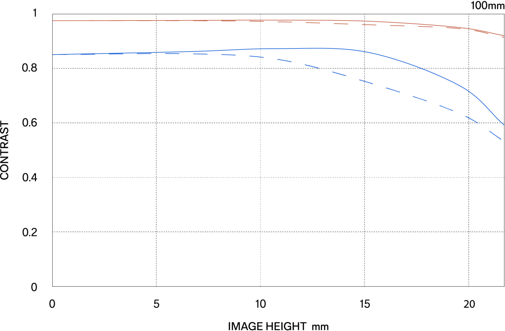The MTF (Modulation Transfer Function) is one of the measurements for evaluating a lens’ performance, and it shows how faithfully the contrast of the subject can be reproduced on the image plane. The horizontal axis shows the image height (distance from the center of the image in mm) and the vertical axis shows the contrast value (maximum value is 1).