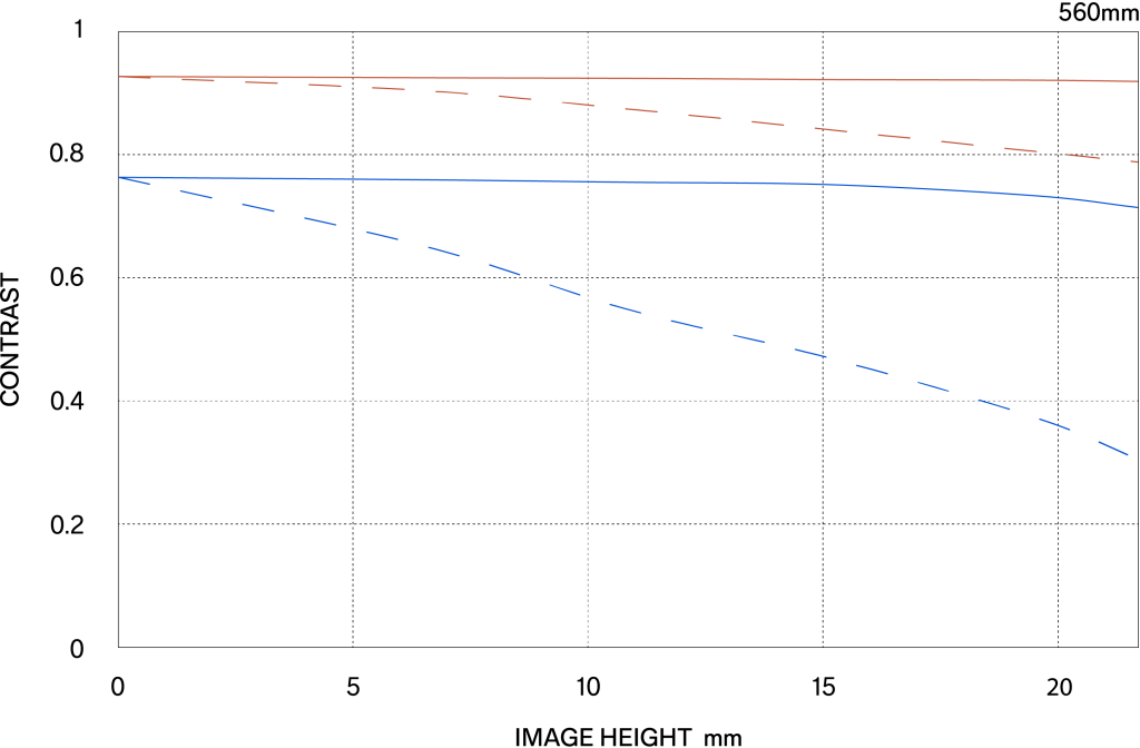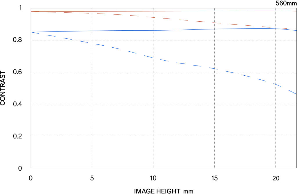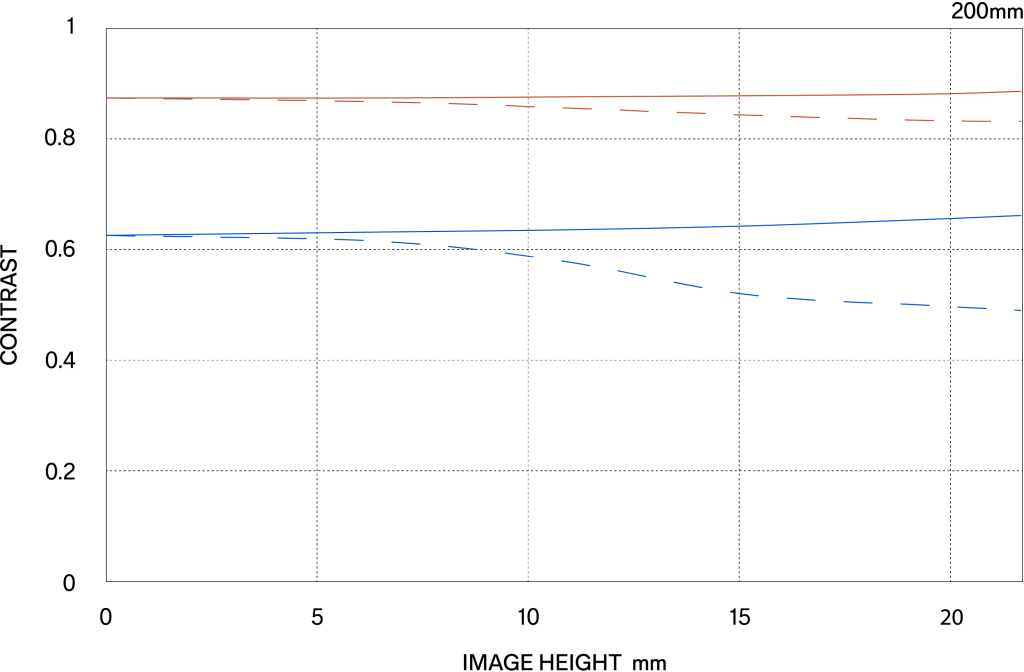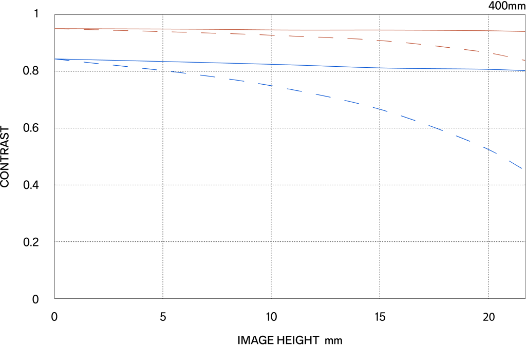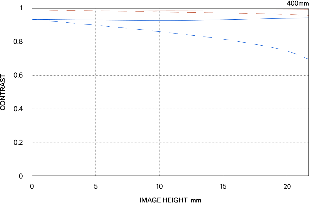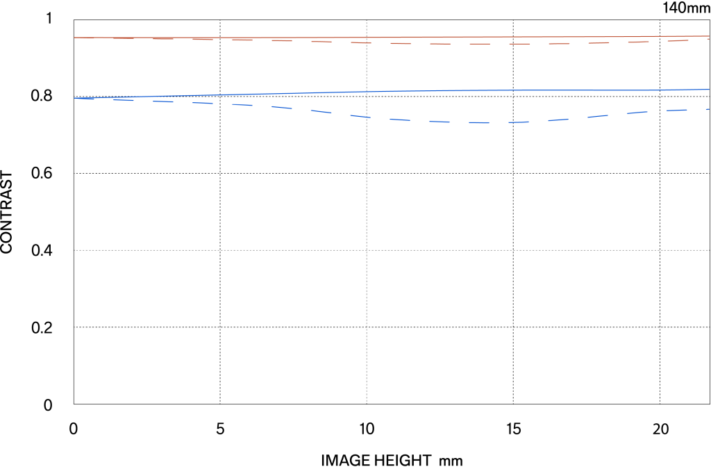 The MTF (Modulation Transfer Function) is one of the measurements for evaluating a lens’ performance, and it shows how faithfully the contrast of the subject can be reproduced on the image plane. The horizontal axis shows the image height (distance from the center of the image in mm) and the vertical axis shows the contrast value (maximum value is 1).