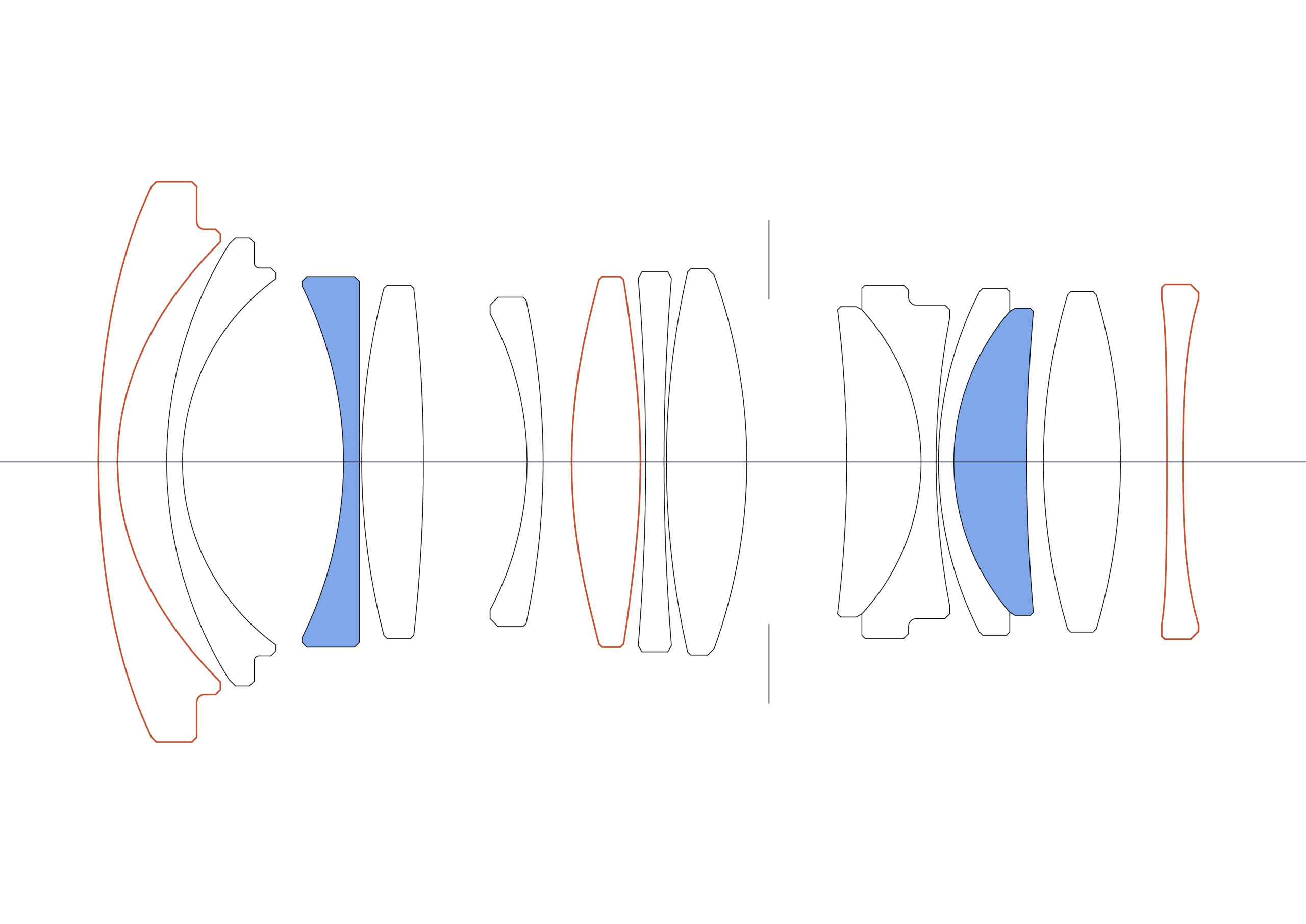 Three double-sided aspherical lenses and two SLD glass elements are effectively arranged to achieve high optical performance from a wide-open aperture of F1.4. Sagittal coma flare is also well corrected, ensuring clear, crisp images from edge to edge, even in starry night scenes where fine details and sharpness are essential.