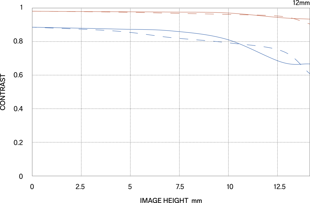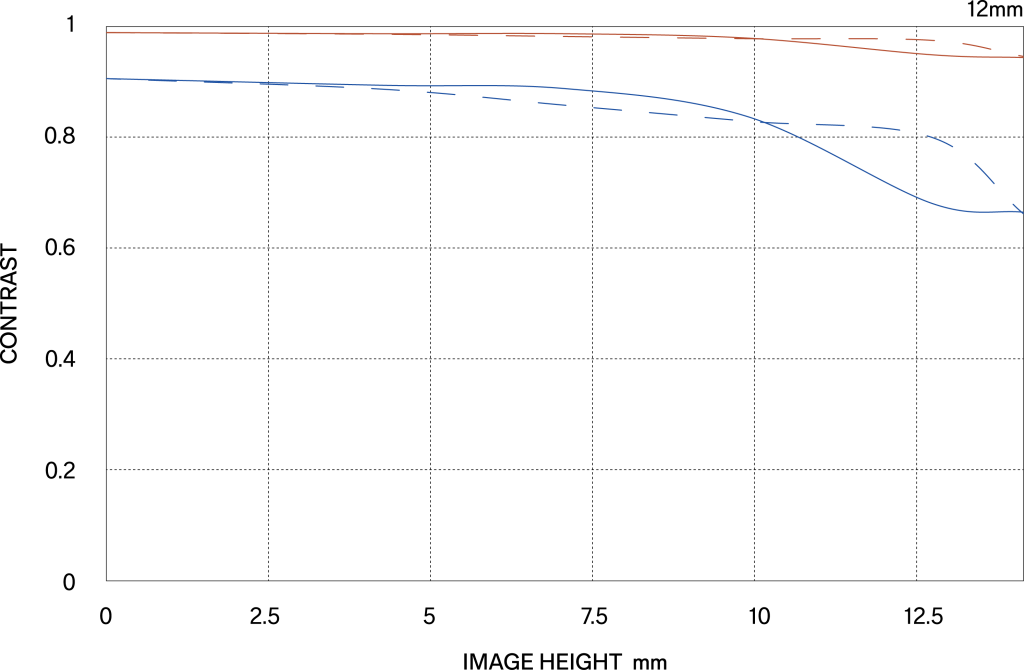 The MTF (Modulation Transfer Function) is one of the measurements for evaluating a lens’ performance, and it shows how faithfully the contrast of the subject can be reproduced on the image plane. The horizontal axis shows the image height (distance from the center of the image in mm) and the vertical axis shows the contrast value (maximum value is 1).