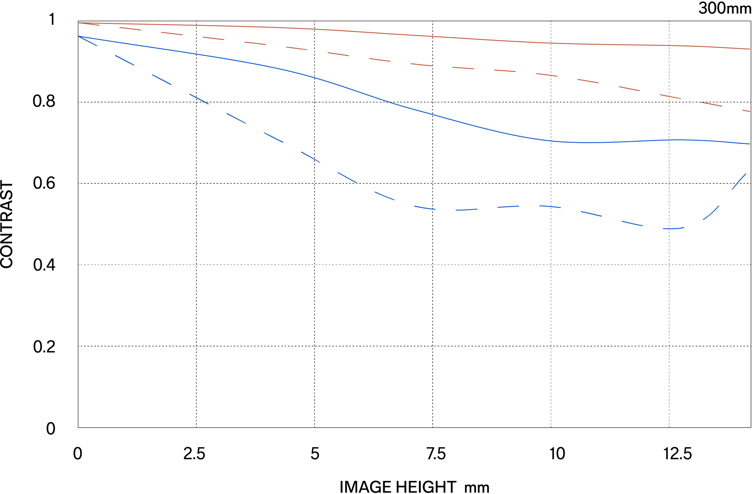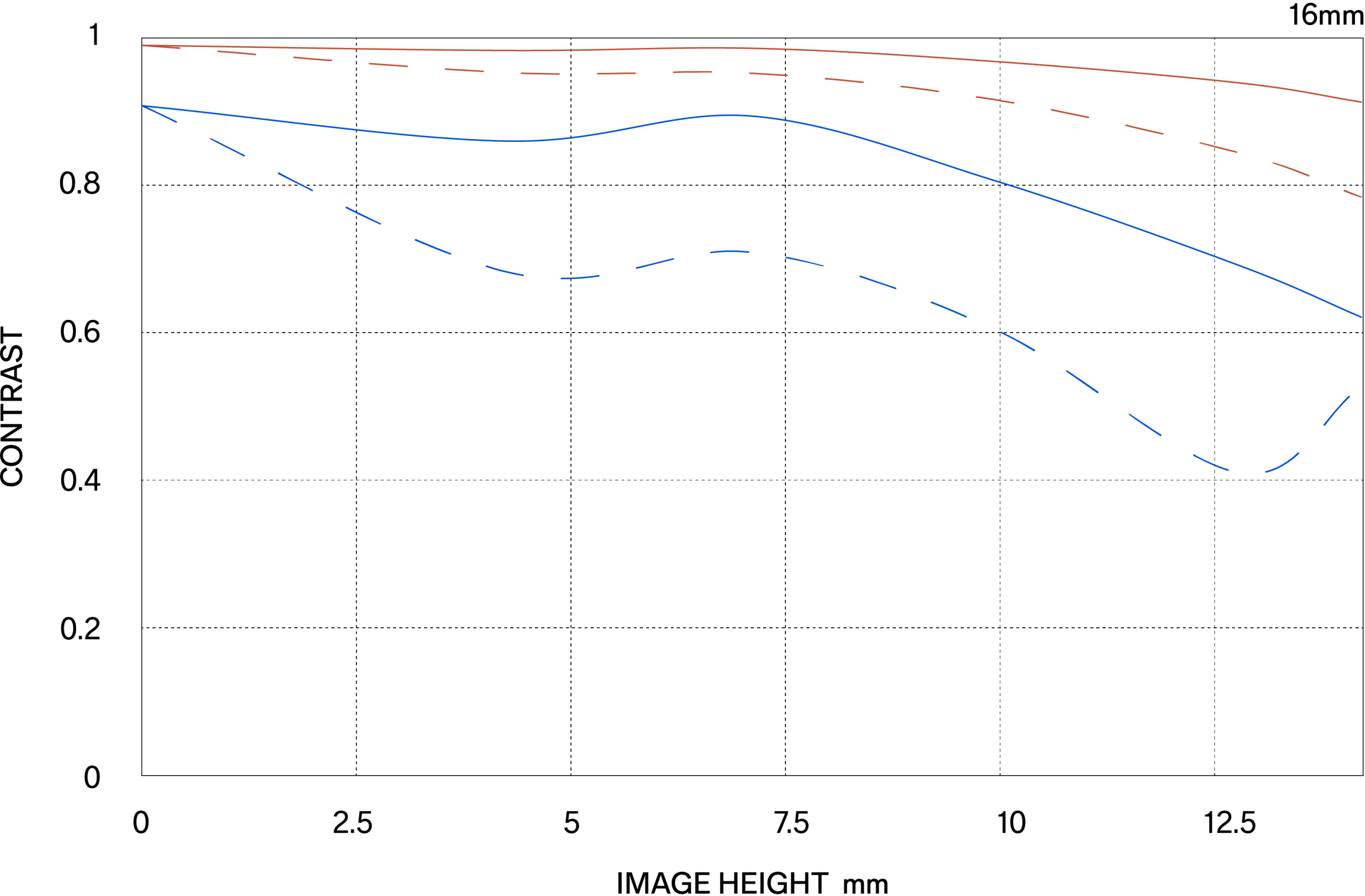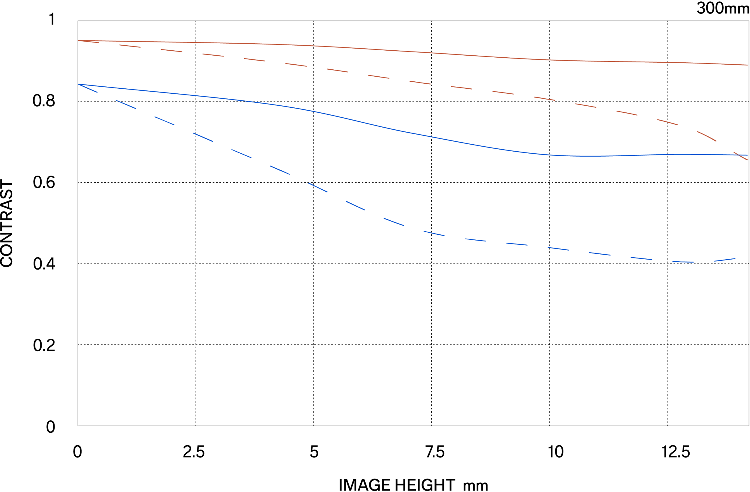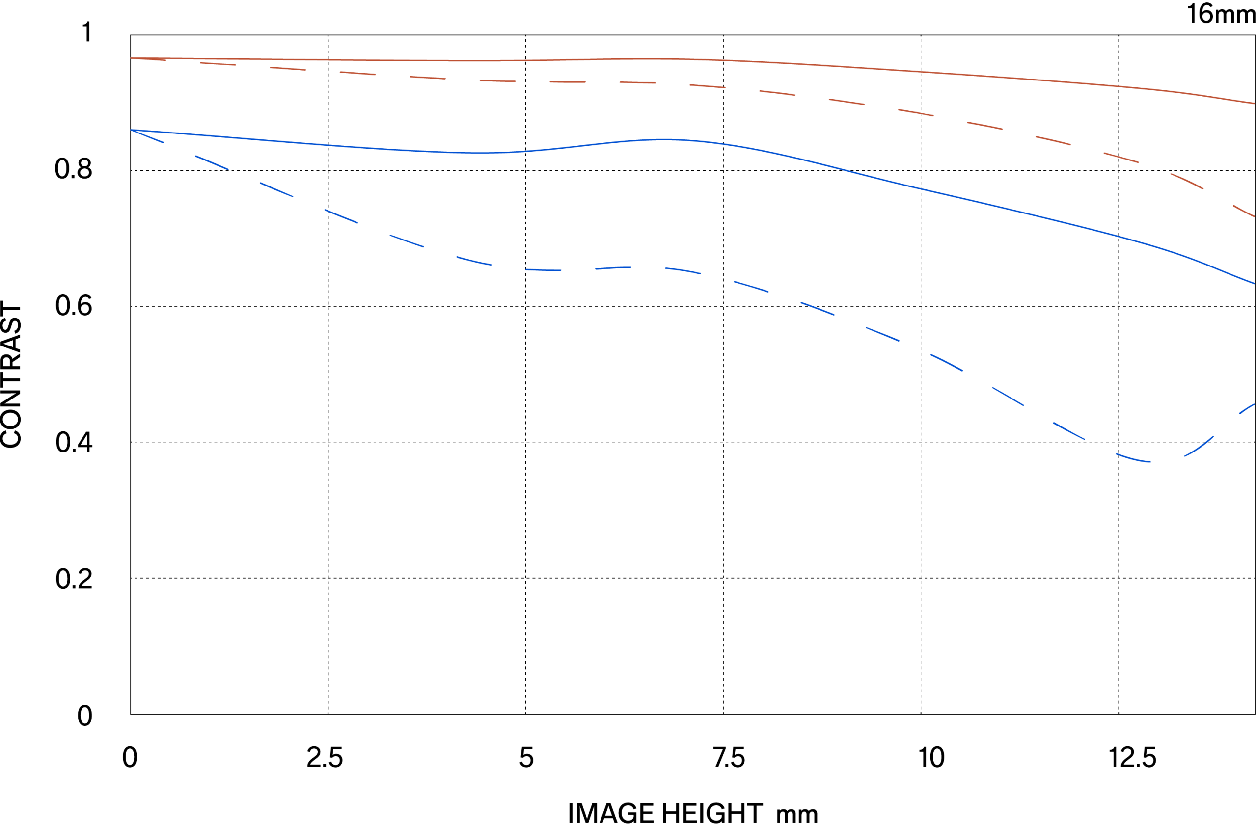 The MTF (Modulation Transfer Function) is one of the measurements for evaluating a lens’ performance, and it shows how faithfully the contrast of the subject can be reproduced on the image plane. The horizontal axis shows the image height (distance from the center of the image in mm) and the vertical axis shows the contrast value (maximum value is 1).