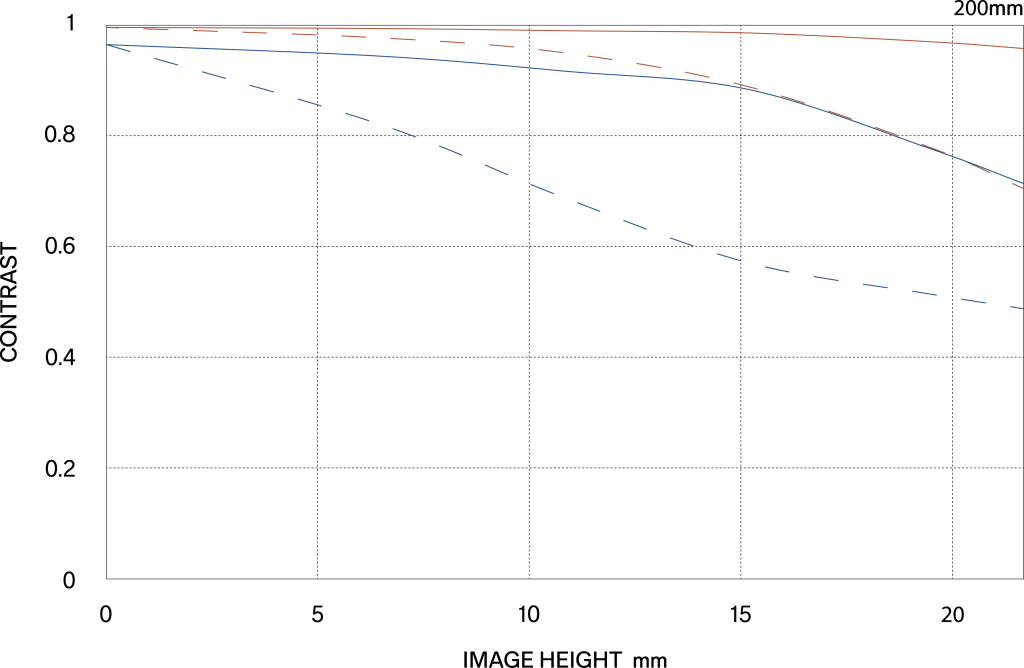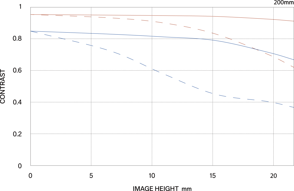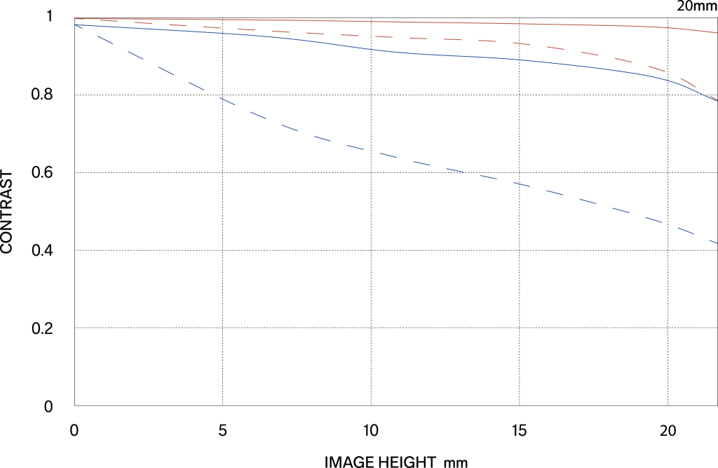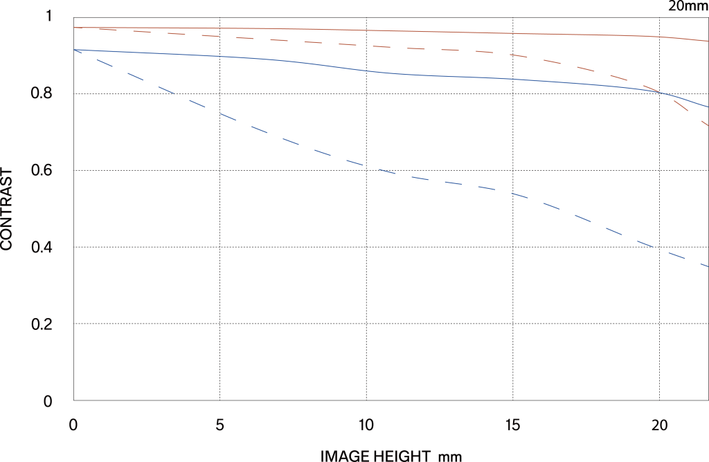 The MTF (Modulation Transfer Function) is one of the measurements for evaluating a lens’ performance, and it shows how faithfully the contrast of the subject can be reproduced on the image plane. The horizontal axis shows the image height (distance from the center of the image in mm) and the vertical axis shows the contrast value (maximum value is 1).