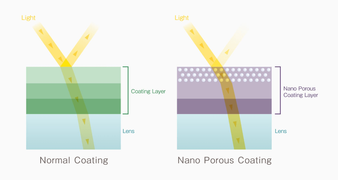 “NPC (Nano Porous Coating)” incorporates porous silica as the coating material. The porous silica layer has nano-sized holes with air inside. Having holes of this size enables a large reduction in the refractive index, allowing the reflectance to be lowered more than conventional anti-reflective coatings. As a result, reflected light causing flares and ghosting is sharply reduced, achieving clear image quality.