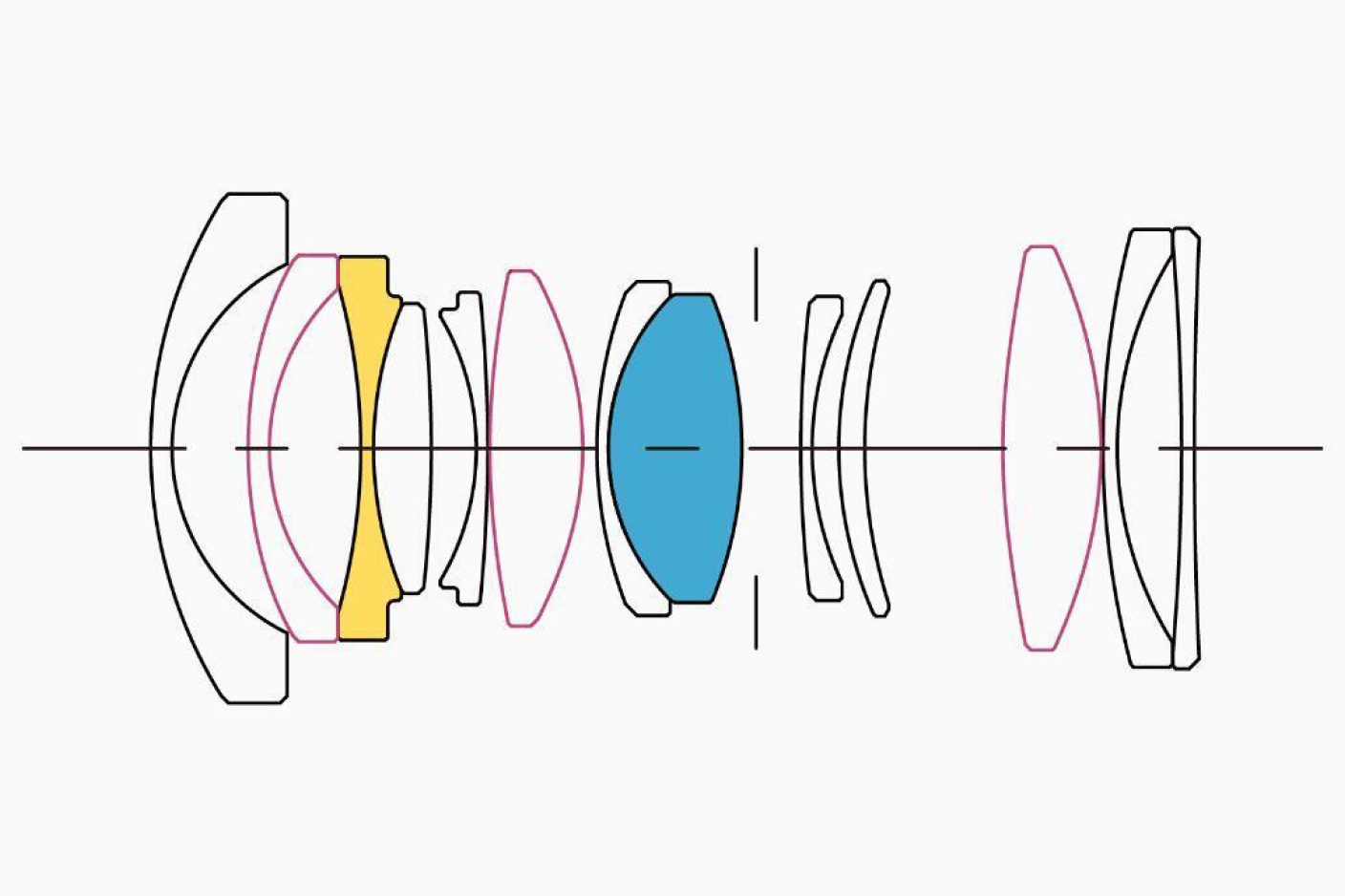 Lens construction: 13 elements in 11 groups, with 1 FLD, 1 SLD and 3 aspherical lens elements