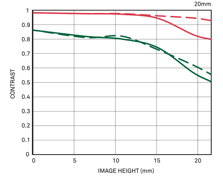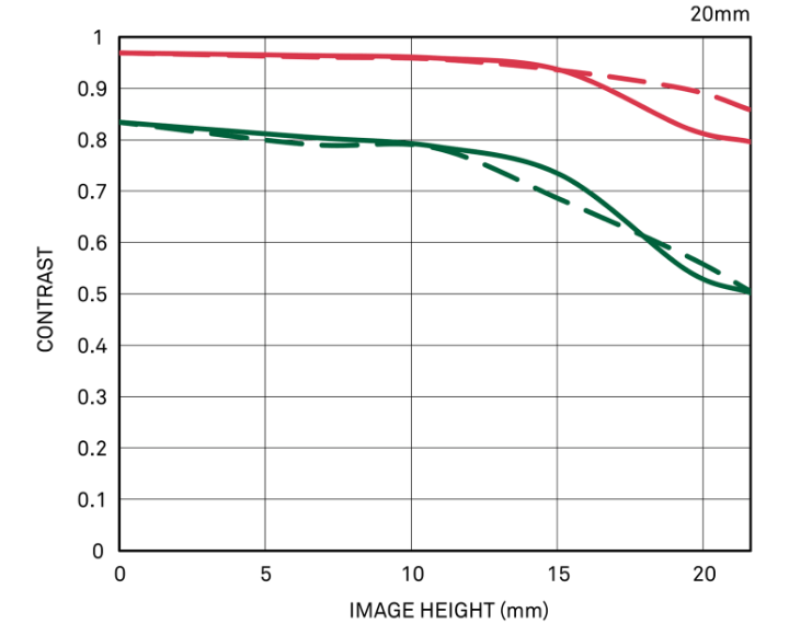 The MTF (Modulation Transfer Function) is one of the measurements for evaluating a lens’ performance, and it shows how faithfully the contrast of the subject can be reproduced on the image plane. The horizontal axis shows the image height (distance from the center of the image in mm) and the vertical axis shows the contrast value (maximum value is 1).