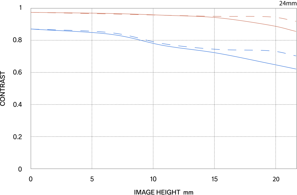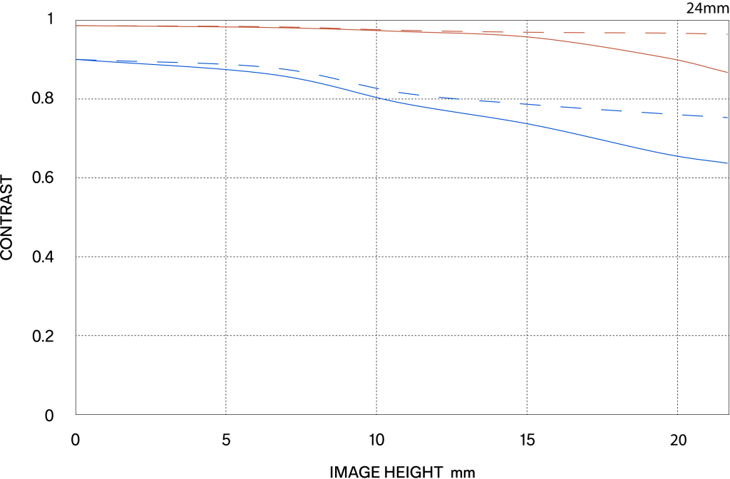 The MTF (Modulation Transfer Function) is one of the measurements for evaluating a lens’ performance, and it shows how faithfully the contrast of the subject can be reproduced on the image plane. The horizontal axis shows the image height (distance from the center of the image in mm) and the vertical axis shows the contrast value (maximum value is 1).