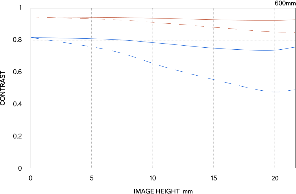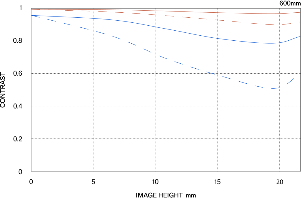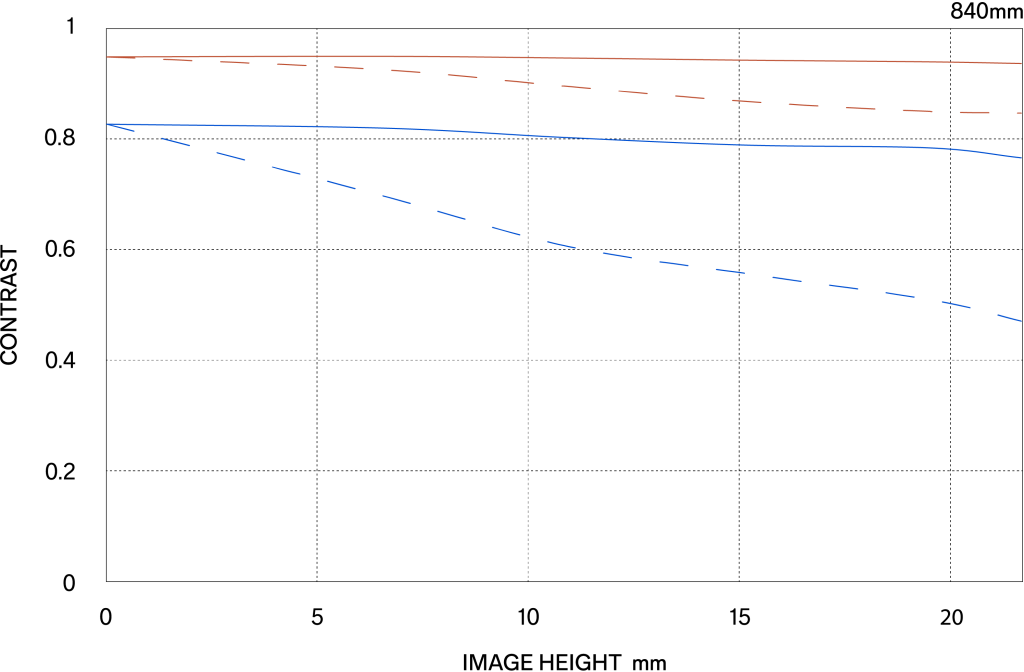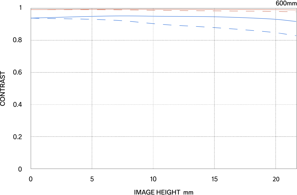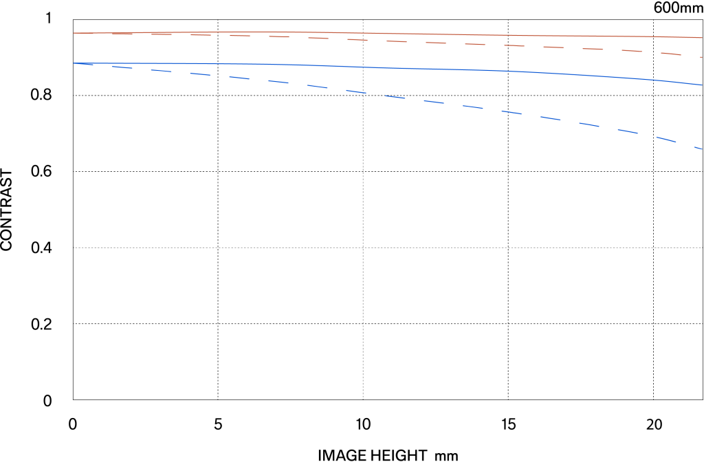 The MTF (Modulation Transfer Function) is one of the measurements for evaluating a lens’ performance, and it shows how faithfully the contrast of the subject can be reproduced on the image plane. The horizontal axis shows the image height (distance from the center of the image in mm) and the vertical axis shows the contrast value (maximum value is 1).