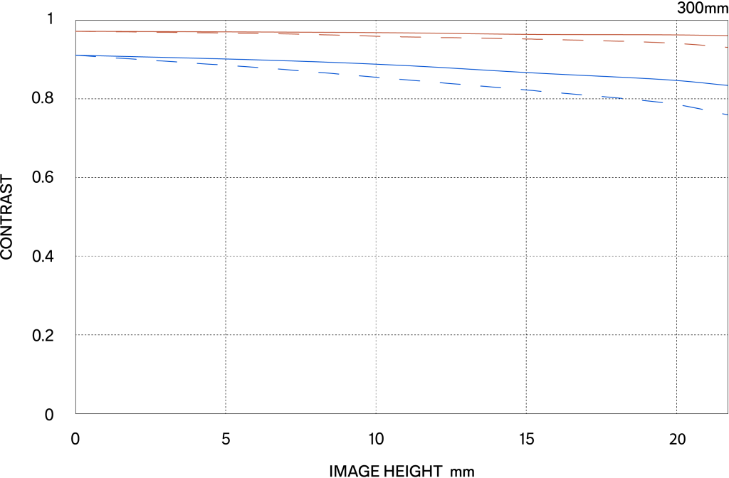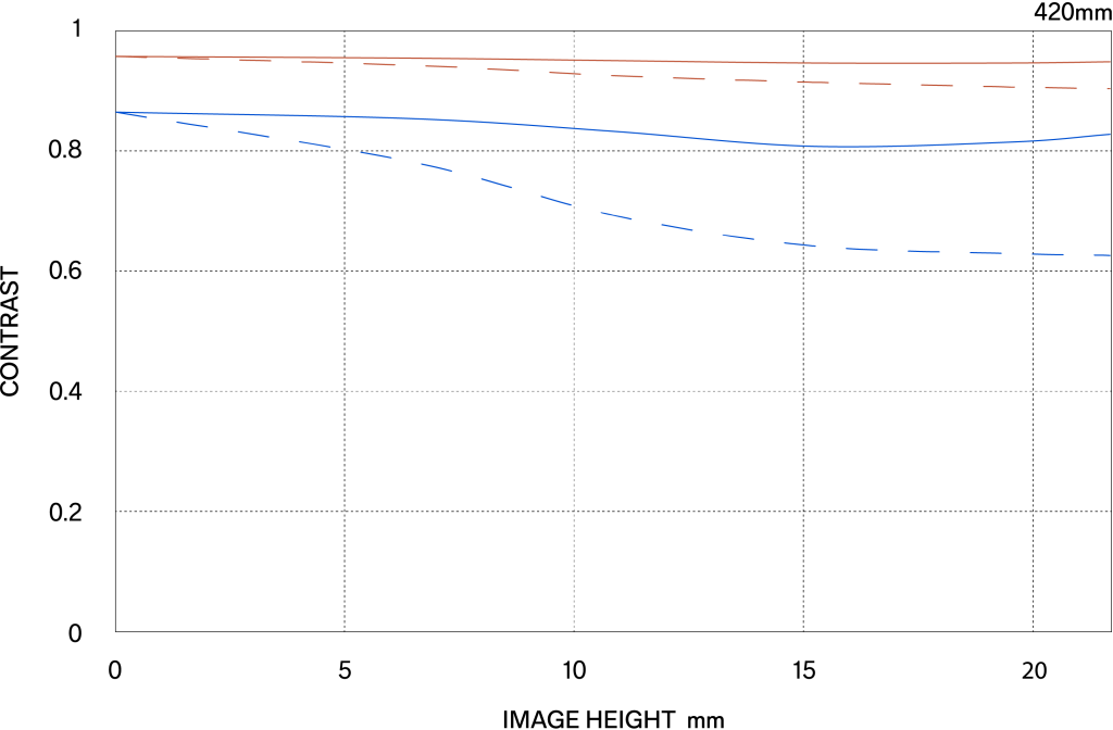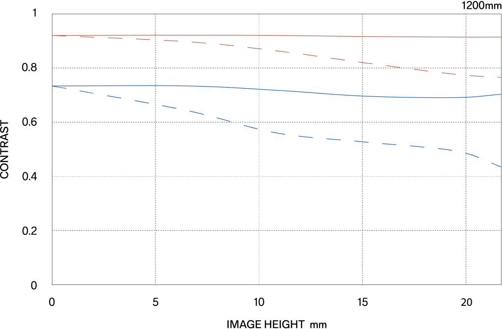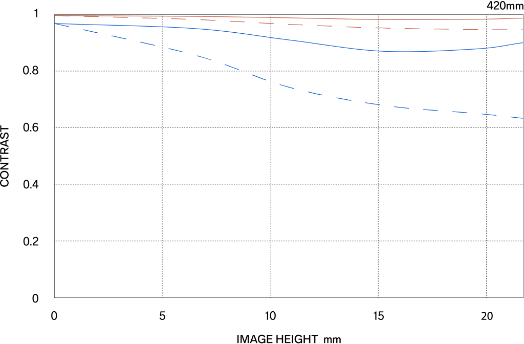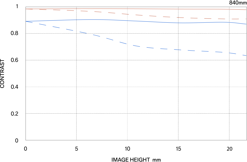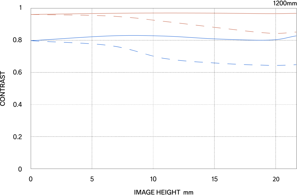 The MTF (Modulation Transfer Function) is one of the measurements for evaluating a lens’ performance, and it shows how faithfully the contrast of the subject can be reproduced on the image plane. The horizontal axis shows the image height (distance from the center of the image in mm) and the vertical axis shows the contrast value (maximum value is 1).