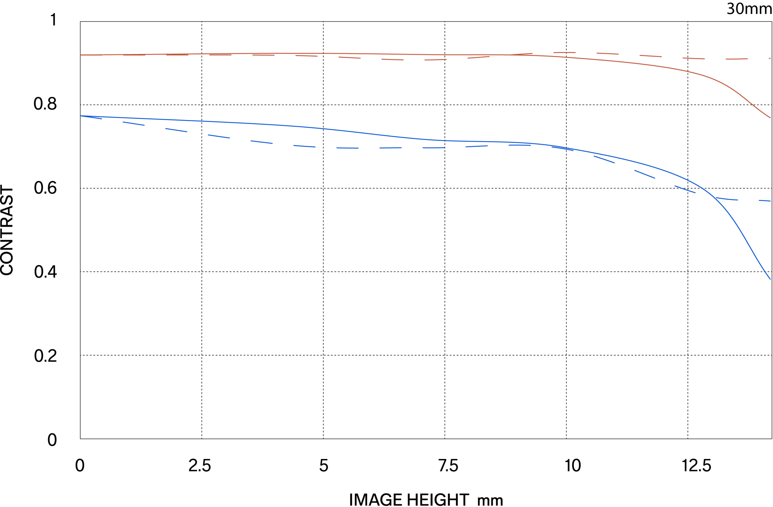 The closer the 10 line pairs/mm curve is to 1, the higher the contrast and clarity of the lens is, and similarly, the closer the 30 line pairs/mm curve is to 1, the better the resolution and sharpness of the lens is.