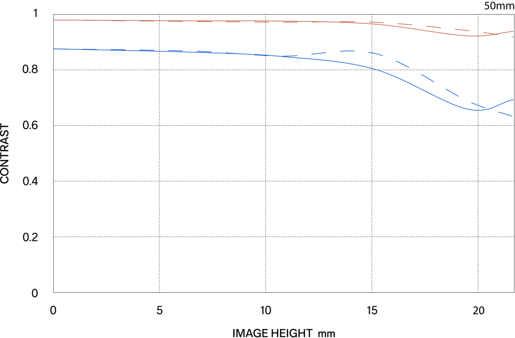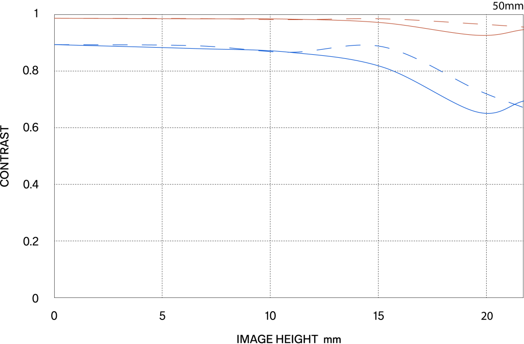 The MTF (Modulation Transfer Function) is one of the measurements for evaluating a lens’ performance, and it shows how faithfully the contrast of the subject can be reproduced on the image plane. The horizontal axis shows the image height (distance from the center of the image in mm) and the vertical axis shows the contrast value (maximum value is 1).