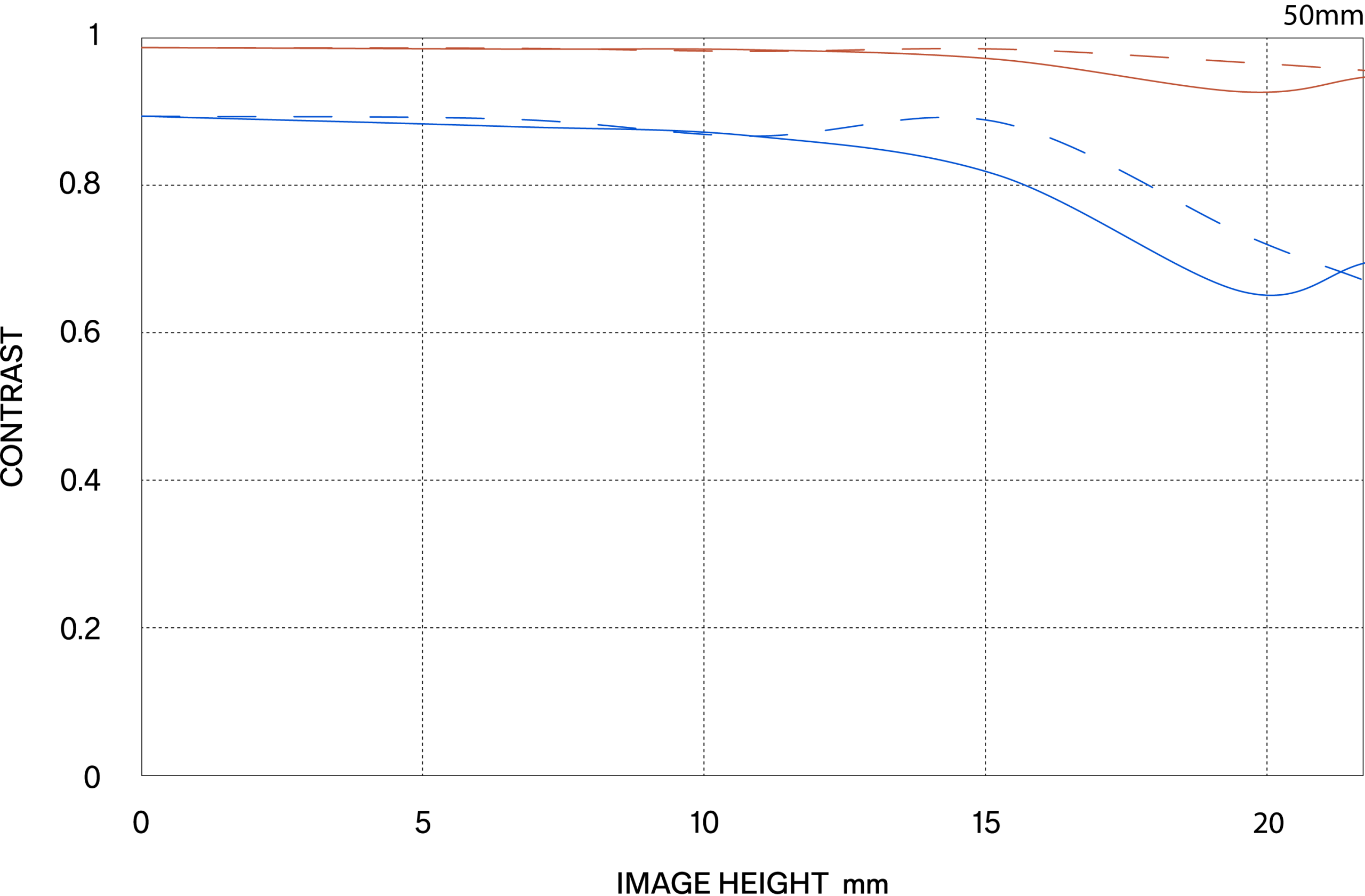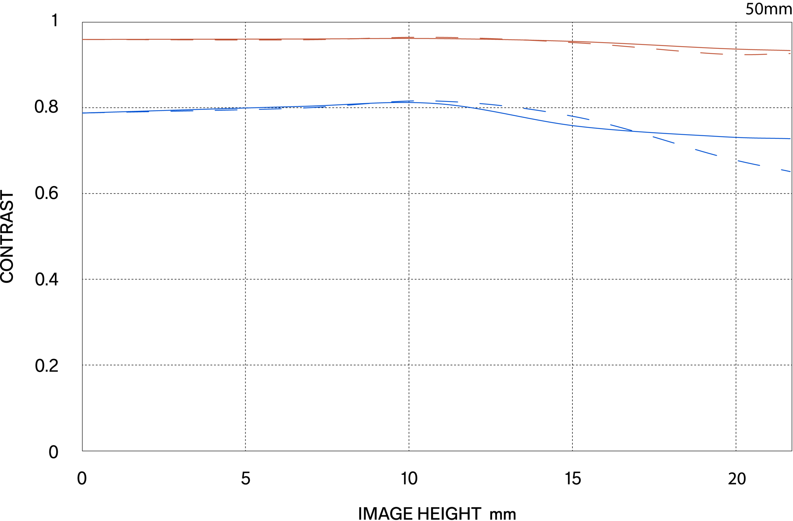 The MTF (Modulation Transfer Function) is one of the measurements for evaluating a lens’ performance, and it shows how faithfully the contrast of the subject can be reproduced on the image plane. The horizontal axis shows the image height (distance from the center of the image in mm) and the vertical axis shows the contrast value (maximum value is 1).