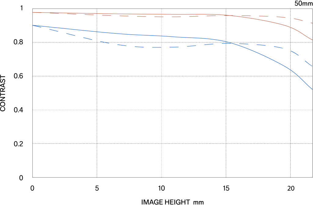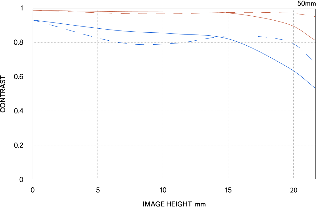 The MTF (Modulation Transfer Function) is one of the measurements for evaluating a lens’ performance, and it shows how faithfully the contrast of the subject can be reproduced on the image plane. The horizontal axis shows the image height (distance from the center of the image in mm) and the vertical axis shows the contrast value (maximum value is 1).