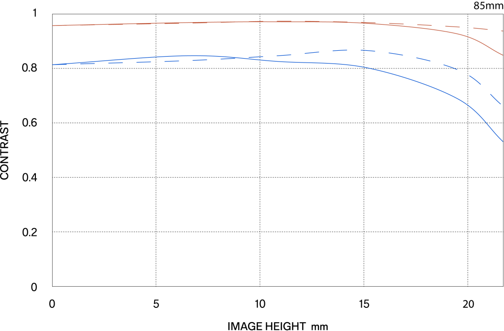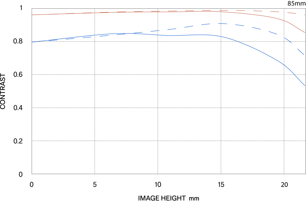 The MTF (Modulation Transfer Function) is one of the measurements for evaluating a lens’ performance, and it shows how faithfully the contrast of the subject can be reproduced on the image plane. The horizontal axis shows the image height (distance from the center of the image in mm) and the vertical axis shows the contrast value (maximum value is 1).