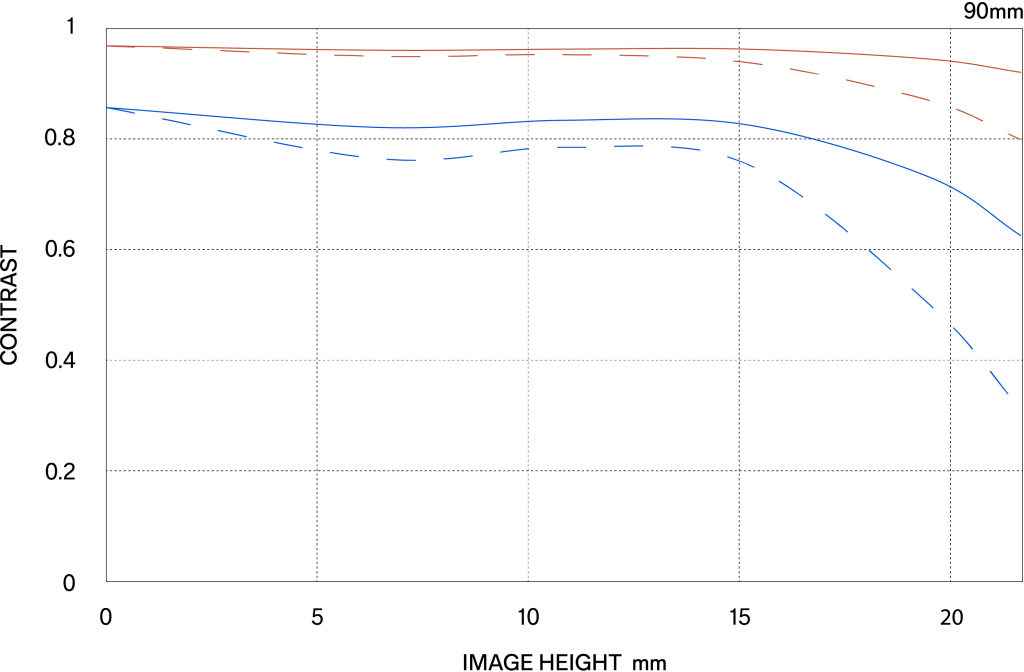 The MTF (Modulation Transfer Function) is one of the measurements for evaluating a lens’ performance, and it shows how faithfully the contrast of the subject can be reproduced on the image plane. The horizontal axis shows the image height (distance from the center of the image in mm) and the vertical axis shows the contrast value (maximum value is 1).