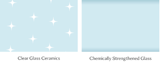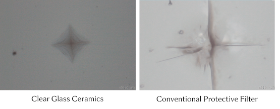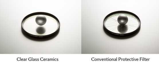 In the chemically strengthened glass used in conventional high-strength protective filters, only the surface is strengthened through chemical processes. In contrast, Clear Glass Ceramics is made with a special heat treatment that precipitates microcrystals of a mineral called spinel evenly throughout, giving the entire filter consistent strength. Combining much greater hardness than chemically strengthened glass and greater flexibility than sapphire crystal glass, Clear Glass Ceramics is the ideal material for protective filters. Clear Glass Ceramics is also resistant to cracking due to small scratches or chips. Since the risk of shattering and producing fragments is reduced, it also offers an enhanced level of safety.